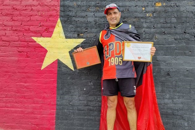 Lo hizo motivado por el aniversario Nro. 119 de la institución, ya que es hincha del club, y fue acompañado por representantes de agrupaciones sabaleras corondinas como “Los Toma Soda” y recibido por representantes de la Comisión Directiva que le entregaron un diploma de reconocimiento por la travesía en homenaje al rojinegro.
