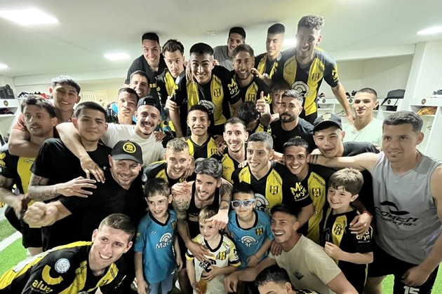 Con toda la confianza. El plantel de Deportivo Madryn festeja en el vestuario la goleada 5-1 como local sobre Almirante Brown. El triunfo le posibilita llegar a la última fecha con la chance de jugar la final por el primer ascenso ante San Martín de Tucumán, siempre y cuando le gane a Colón en el Centenario.