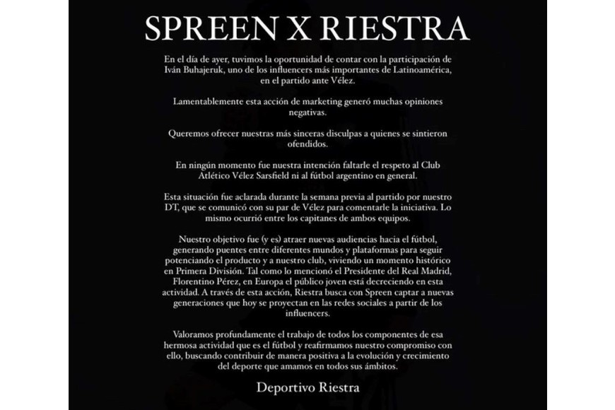 El club Deportivo Riestra emitió un comunicado en sus redes sociales ofreciendo las "más sinceras disculpas" por la inclusión del influencer Ivan Buhajeruk, más conocido como "Spreen", en el empate ante Vélez por la fecha 22 de la Liga Profesional de Fútbol 2024.