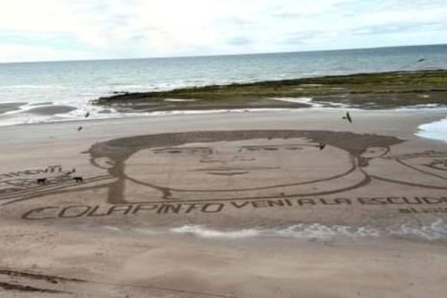 La ColapintoMania no muestra signos de parar. Este miércoles, una playa de Las Grutas amaneció con una imagen del piloto argentino dibujada en la arena y no tardó en ser furor en las redes sociales.