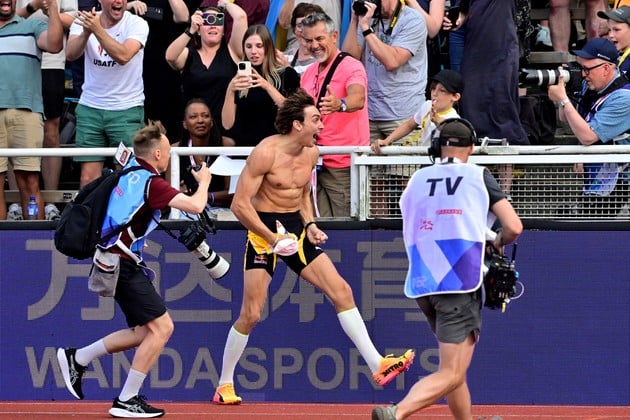 Después de pasar a la primera 5,60; 5,80; 5,90 y 6 metros, Duplantis, derrotado el australiano Kurtis Marschall, se olvidó esta vez de alturas intermedias y de su récord del estadio (6,16m en 2022) para poner directamente el listón en 6,28 metros. Puso toda su concentración y su energía y lo superó a la primera, como si fuera inevitable, y reveló que no arriesgó con una pértiga más dura de lo normal ni agarrando la pértiga más atrás de lo que acostumbra. "Seguramente éste sea el agarre más bajo que he tenido batiendo un récord mundial, pero tenía la suficiente energía para hacerlo", contó.