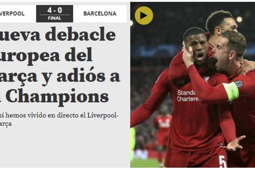 Por último, Mundo Deportivo, matutino editado en Barcelona, afirma; "Nueva debacle europea del Barsa y adiós a la Champions", "Un naufragio peor que el de Roma (el año pasado fue eliminado en instancias de cuartos por 3 a 0), es la segunda vez en dos años", "El Liverpool atropella al Barsa porque la intensidad y el físico de los ingleses se impuso desde el minuto uno".