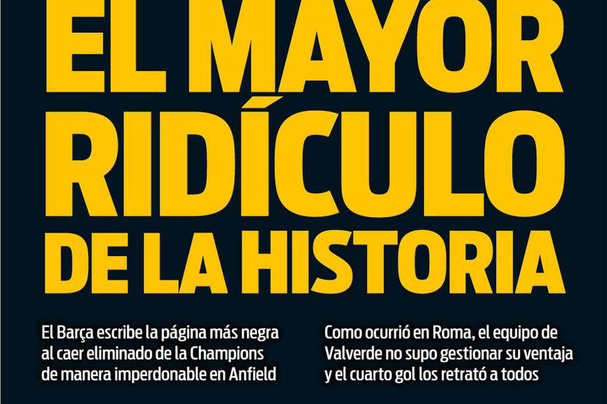 "Hoy el corazón de los "culé" de todo el mundo llora de rabia e impotencia, el corazón de los barcelonistas está destrozado", "No hay otro adjetivo para calificar el mayor fracaso de la historia del Barsa", "El espantoso ridículo cosechado por el equipo de Ernesto Valverde no tiene precedentes", "Hay muchos culpables de este tremendo fracaso, demasiados, un KO que sella un antes y un después para este equipo", fueron algunos de los ásperos encabezamientos del medio catalán.