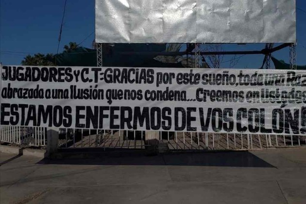 Sin embargo, la hinchada se hizo presente en la "Ciudad del Sol" y dejó un mensaje para el equipo. "Jugadores y C.D: Gracias por este sueño, toda una raza abrazada a una ilusión que nos condena...Creemos en ustedes. ¡Estamos enfermos de vos Colón!", dice el pasacalle que apareció colgado en las inmediaciones de la burbuja del equipo de Santa Fe.