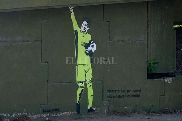 “Podrán destruir estas paredes, pero los héroes son eternos”, fue la frase que eligió Lucas para acompañar la figura del futbolista.
