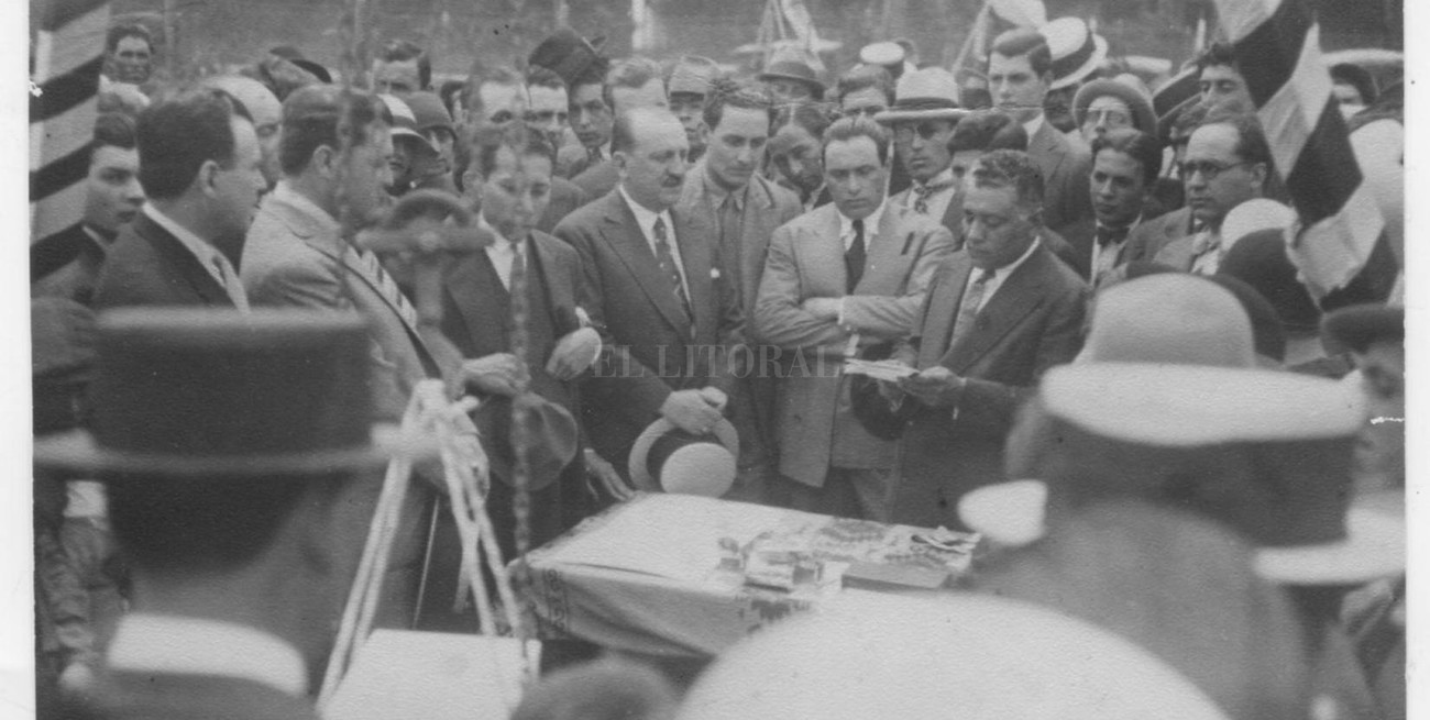 Unión (1928) colocación de la piedra fundamental de la actual cancha de Bulevar Pellegrini y San Lorenzo. El Dr Luis Ramírez leyendo el discurso. Foto: Archivo El Litoral