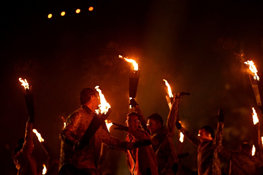 Artistas actúan durante los fuegos artificiales. Créditos: Julien De Rosa/Reuters