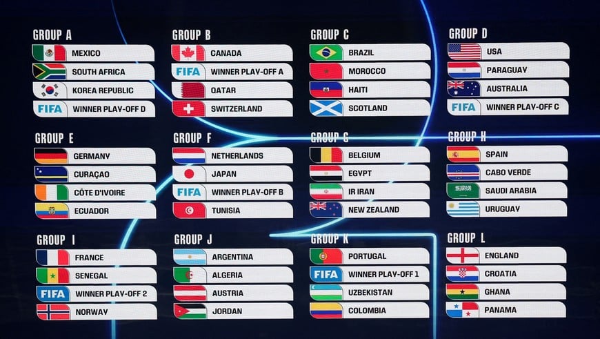 La Copa del Mundo 2026 será la primera con 48 equipos. Se arman 12 grupos (de la A a la L) de cuatro selecciones cada uno. Clasificarán a la fase de eliminación directa los dos primeros de cada zona y los ocho mejores terceros, para conformar un cuadro de 32 equipos en los dieciseisavos de final. En total se jugarán 104 partidos.