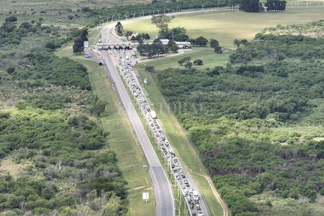 Pasadas las 15, la cola de automóviles era de varios kilómetros por la vía que comunica ambas capitales.