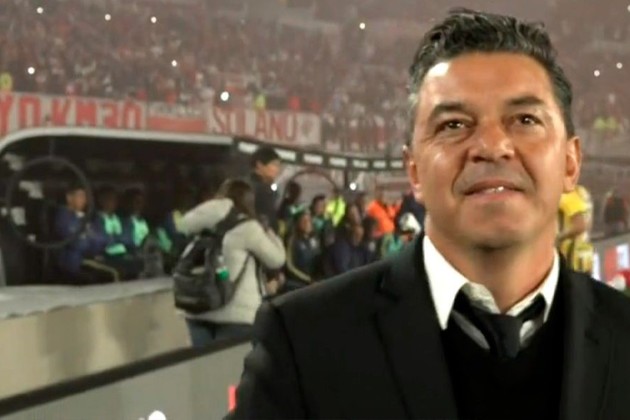 Cuando Gallardo comenzó a asomar al campo de juego, un juego de luces por parte del club y los carteles publicitarios con el lema "muñeco eterno", le dieron la bienvenida al hombre que conquistó dos Copas Libertadores como entrenador en 2015 y 2018.