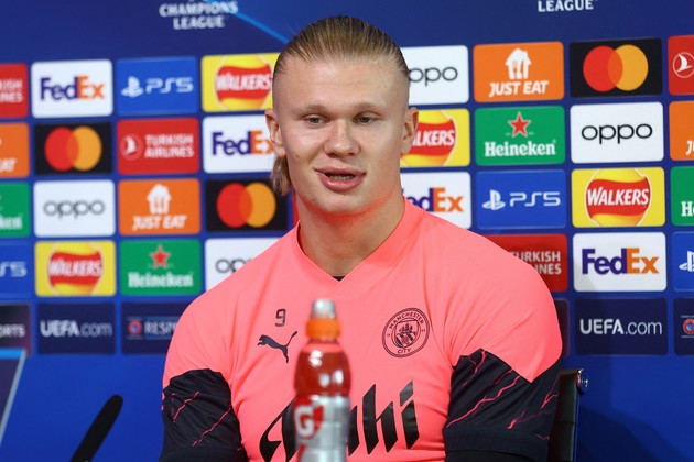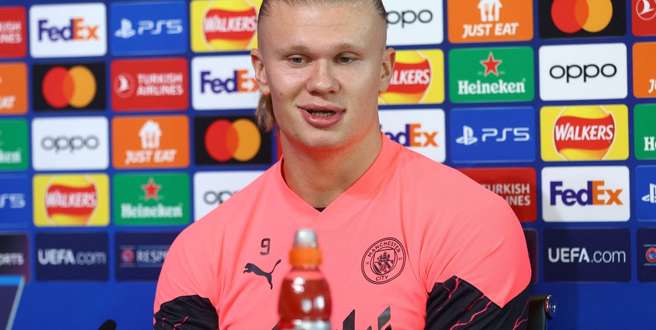 Haaland en conferencia de prensa ante del partido del Manchester City con el Copenhague de Dinamarca por la ida de los octavos de final de la Champions League. Crédito: Reuters/Carl Recine