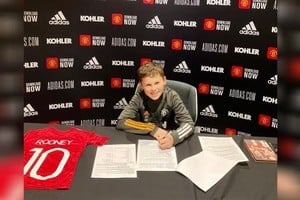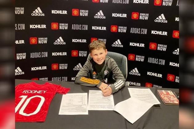 El niño, de 11 años, fue fotografiado junto a su padre y su madre Colleen firmando el contrato que lo une al Manchester, y con la casaca número 10 (la que usaba su padre) en la mano, señaló la BBC Sports.