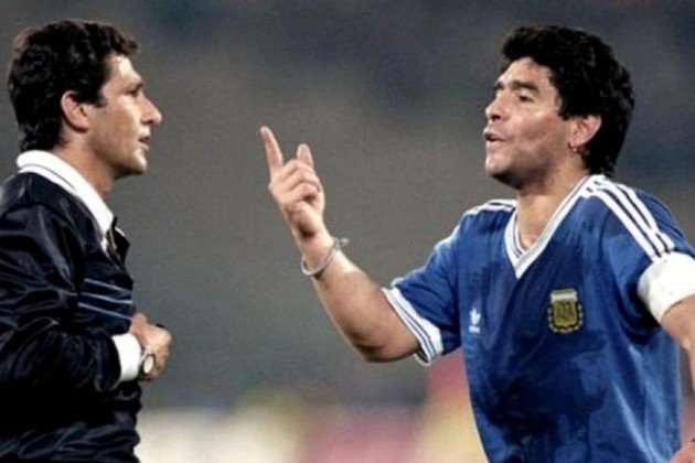 Maradona quejándose con Edgardo Codesal, el árbitro encargado de impartir justicia en la final entre Alemania y Argentina.