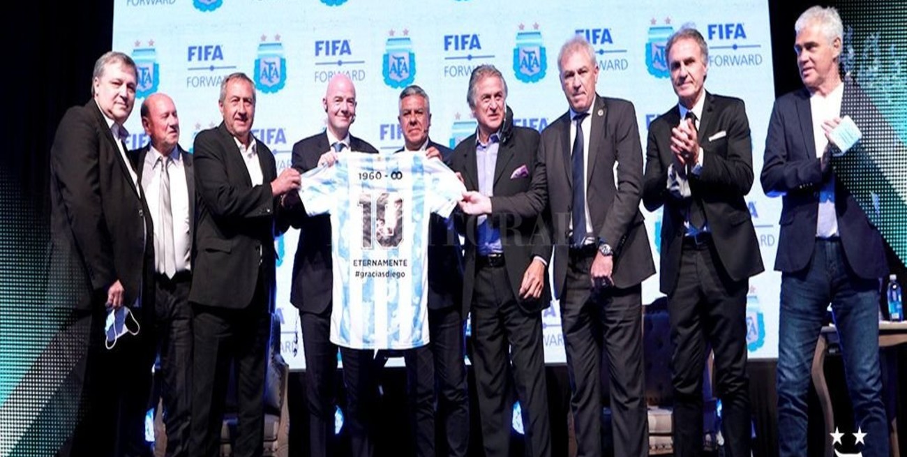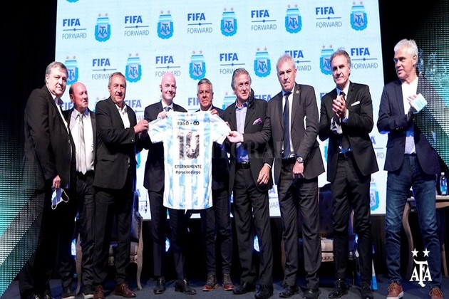 Infantino recibió en manos de Tapia una camiseta argentina con la figura de Diego Maradona como homenaje. El titular de la AFA invitó a algunos campeones del mundo como Ubaldo Fillol, Daniel Bertoni, Oscar Ruggeri, Oscar Garré, Alberto Tarantini y Nery Pumpido para concretar la entrega. Luego, el titular de la FIFA recibió otra camiseta, pero con su apellido y el número "10" en la espalda y saludó a un puñado de dirigentes argentinos como Víctor Blanco, Rodolfo D'Onofrio y José Lemme.