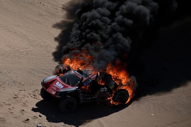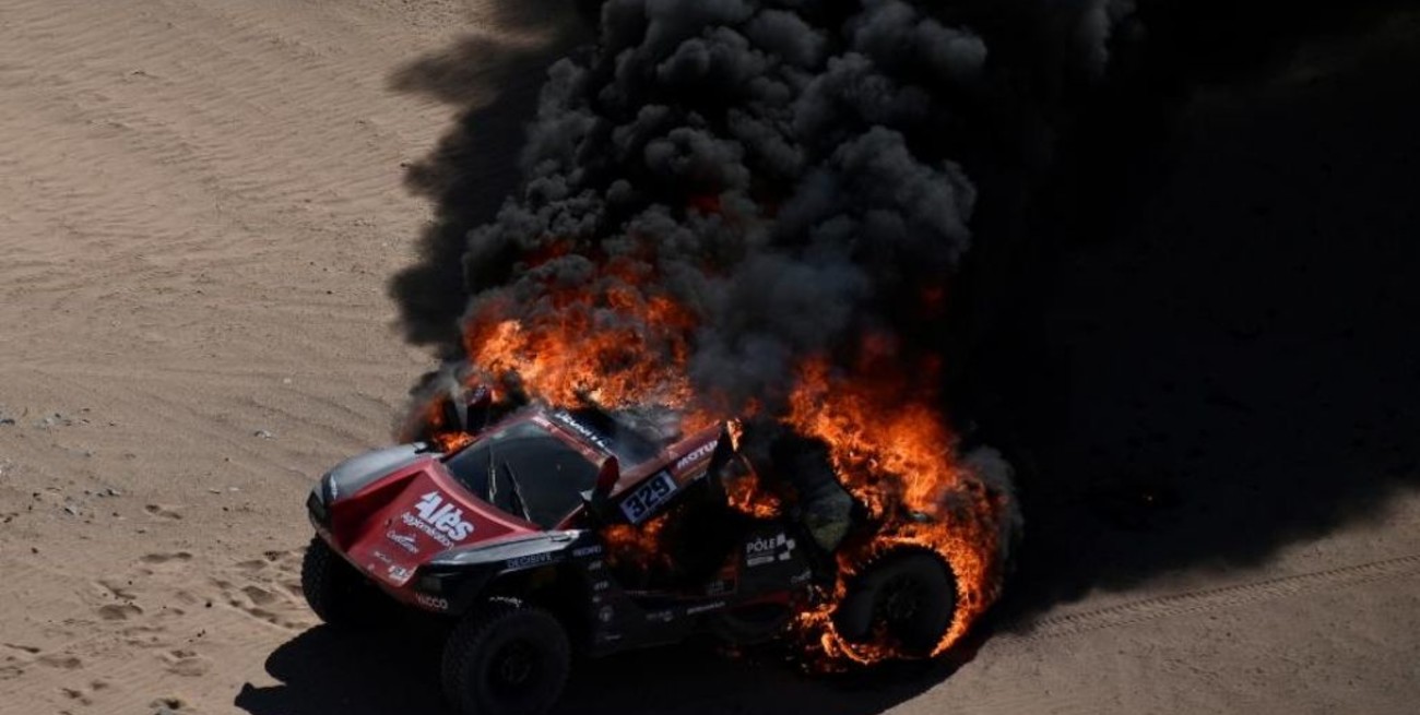 No tardó demasiado el Rally Dakar en dejar sus primeras imágenes impactantes, cuando el auto del francés Romain Dumas (RD Limited), a tan sólo 65 kilómetros de la largada, se prendió fuego dando poco tiempo al piloto y a su partener Alexandre Winocq a abandonar el vehículo.