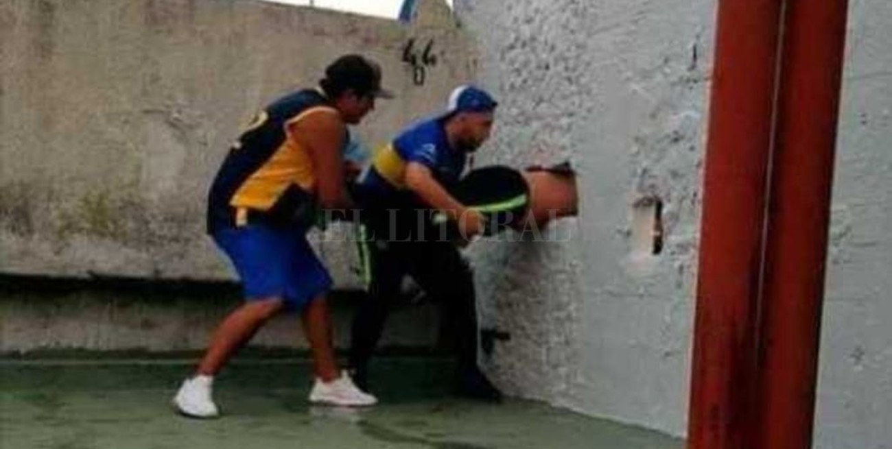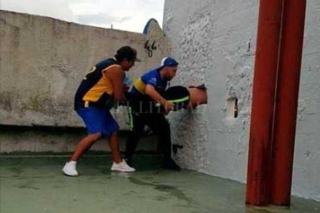 El hombre, que estaba en la popular, vio un hueco en la pared que une dicha tribuna con la platea e intentó sacar provecho del asunto pero, en su intento de pasarse al sector más preferencial, quedó atorado en el agugero.