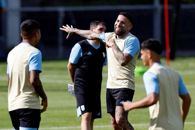 Nicolás Otamendi en una práctica de la sub 23 argentina. Crédito: Thaier Al-Sudani/Reuters