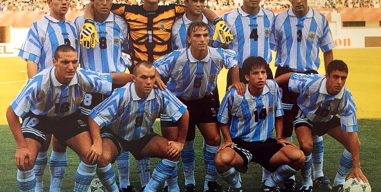 La selección argentina campeona mundial juvenil de 1997, dirigida por José Pekerman, que contó en sus filas a jugadores como Walter Samuel (parado, primero de derecha a izquierda), Pablo Aimar (agachado debajo) y Lionel Scaloni (abajo, primero de izquierda a derecha).