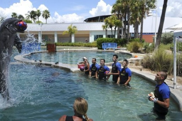 Pedro, Xavi, Villa, Busquets y Valdés asistieron este martes al Seaquarium de Key Biscayne para jugar con los cetáceos. Los delfines demostraron sus habilidades con la pelota, dieron algunos toques e incluso ejecutaron penales con Valdés en el arco.