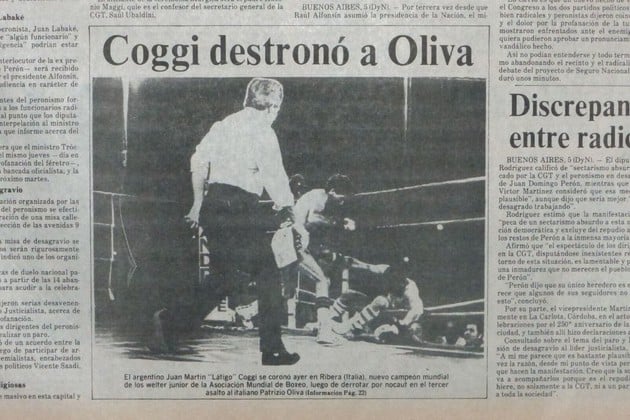 El sábado 4 de julio de 1987, hace 33 años, el campeón argentino welter junior, octavo en el escalafón universal, Juan Martín “Látigo” Coggi (63 kilogramos) derrotó al italiano Patrizio Oliva (63,500 Kgs.) y se alzó con el cetro de esa categoría de la Asociación Mundial de Boxeo.