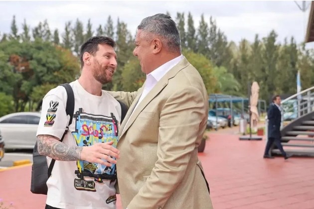 Lionel Messi, detrás de Leones FC, y Claudio "Chiqui" Tapia, presidente de la AFA.