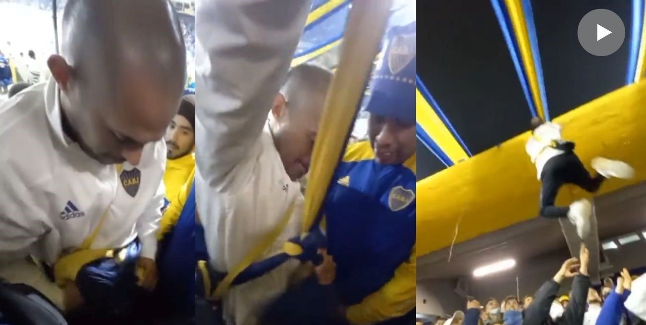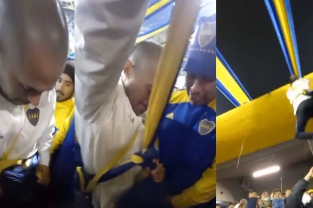 Tirado como una polea por un grupo de “xeneizes” que se encontraban en la bandeja superior, el hincha de Boca se trasladó a una posición superior en el estadio.