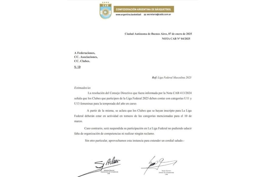 En cuanto a las exigencias para participar, además de tener que abonar una inscripción de $ 2.500.000, los clubes que serán parte de esta 14° edición de la Liga Federal Masculina deberán contar con categorías U11 y U13 en rama femenina, las cuales deberán tener para el día 10 de marzo actividad en torneos de las categorías mencionadas.