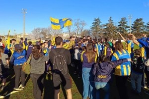 Recibimiento de los hinchas en el pueblo con camisetas y banderas, cotillón, papelitos y hasta una remera con una inscripción que decía “Belgrano” y una A en grande.