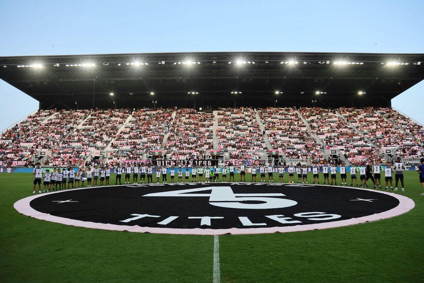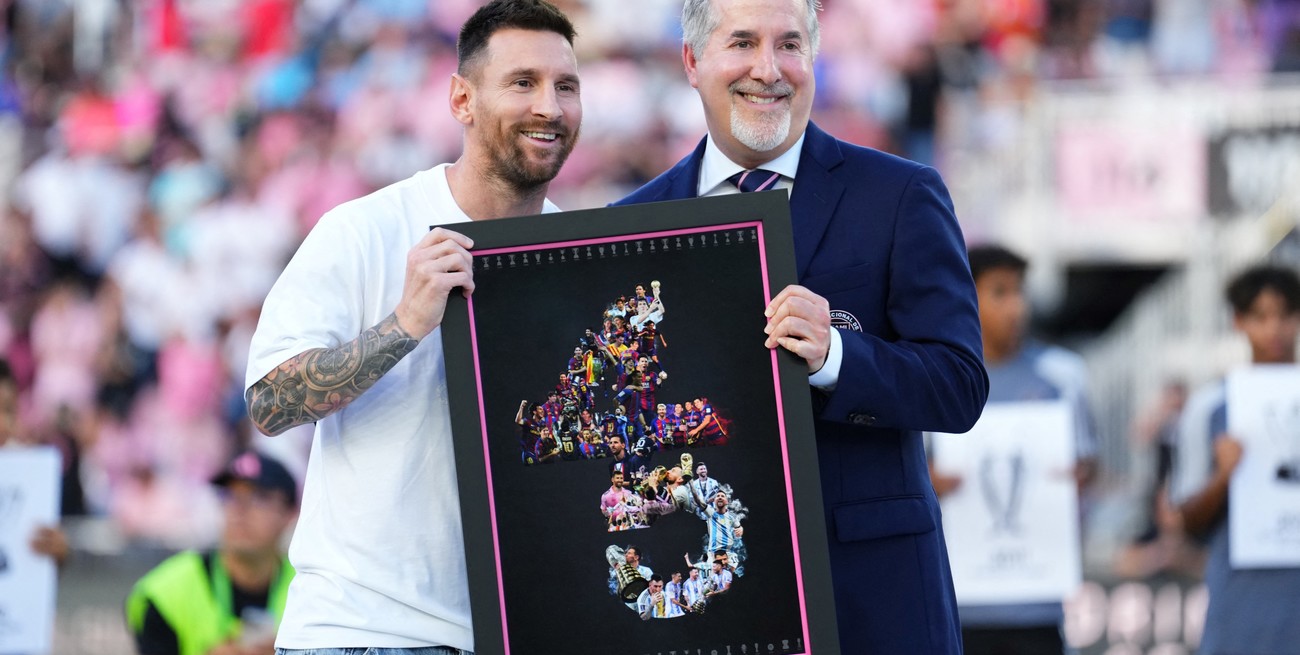 Durante la previa del partido, jugado en el estadio Chase de Fort Lauderdale, 45 futbolistas de las divisiones inferiores del club se alinearon en el campo sosteniendo una foto de cada uno de los trofeos obtenidos por el astro argentino.
