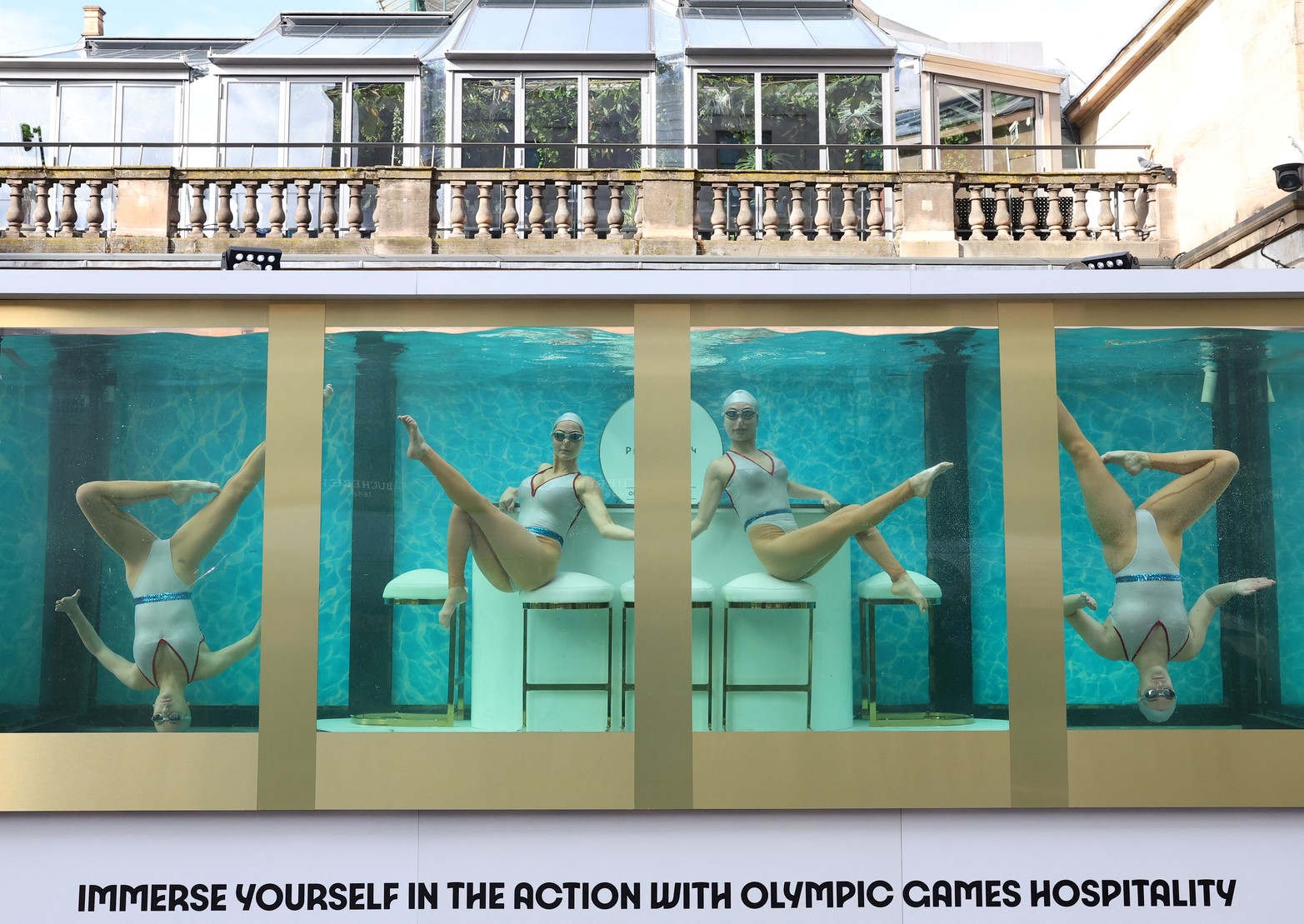 2 / 15 Los nadadores artísticos Sisy Wang y Emily Kuhl de Aquabatix actúan en un gran tanque de agua para marcar 100 días antes de que comiencen los Juegos Olímpicos de París 2024, en Covent Garden en Londres, Gran Bretaña, Foto: Toby Melville