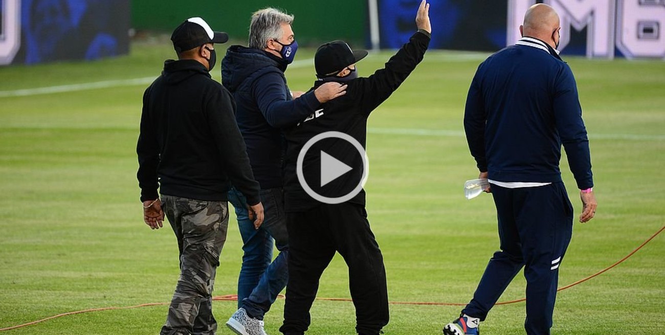 Pellegrino, el anfitrión, le entregó a Maradona una camiseta del club por sus 60 años de vida. Luego de la emoción intensa que vivió, "Pelusa" dejó el sillón que siempre suele ocupar en el banco de suplentes del "Lobo", aunque se aclaró que estaba perfectamente bien de salud y solo fue por precaución.