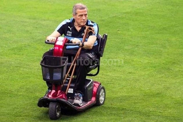 El entrenador de la selección uruguaya camina con muletas y dirige los entrenamiento en una silla de ruedas especial.