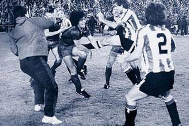Piñas, patadas, agarrones, golpes por todos lados y agresiones de todo tipo... Y Maradona como uno de los principales protagonistas. Recibió una patada pero él también pegó. Un bochorno que recorrió el mundo y que aún hoy se recuerda.