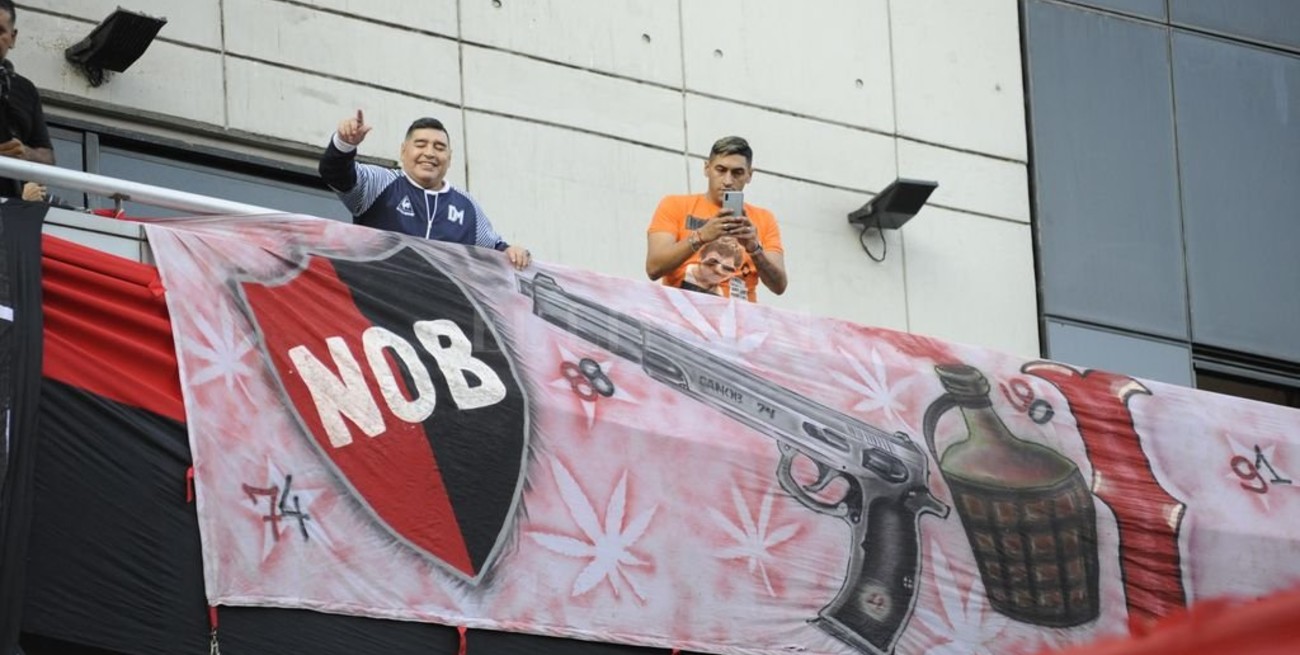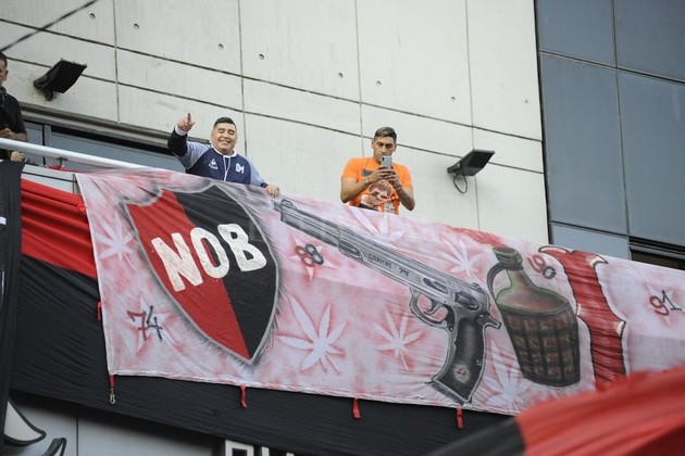 A las 19, Maradona se asomó a un balcón del segundo piso que da a la esquina de Catamarca y Mitre, en el centro de Rosario, desde donde saludó a los hinchas "rojinegros" y firmó varias camisetas del equipo del Parque Independencia que le arrojaron los fanáticos.
