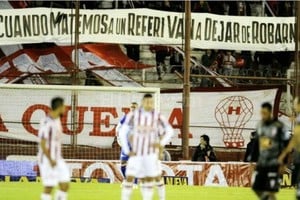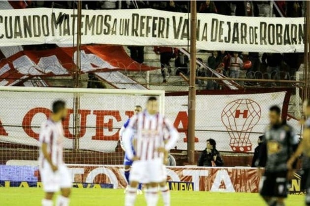 "Cuando matemos a un referí van a dejar de robarnos", decía la bandera blanca con letras negras que fue atada en el alambrado que da a la tribuna popular de Huracán, en el estadio Tomás Adolfo Ducó.