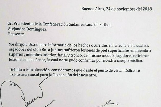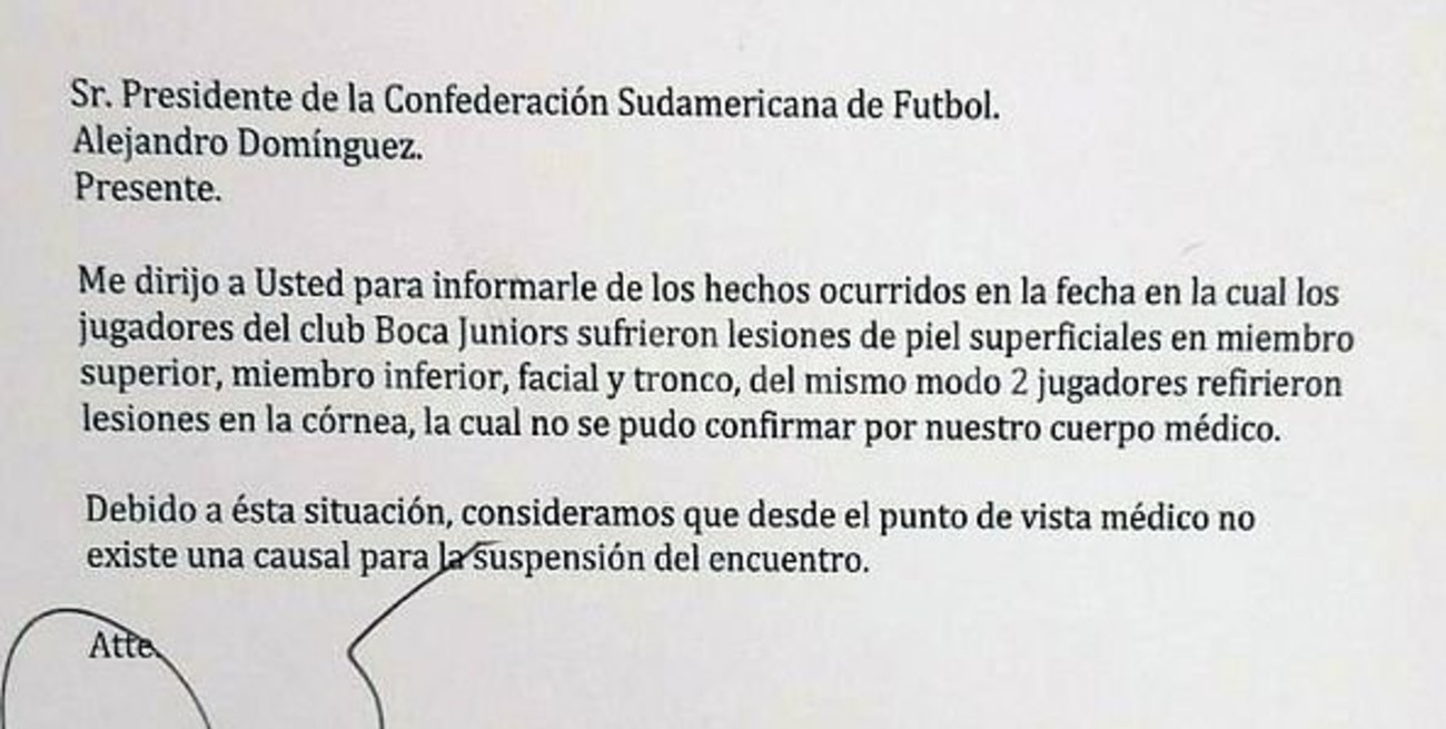 Según una carta firmada por el director de la Comisión Médica, Osvaldo Pangrazio, los jugadores de Boca Juniors sufrieron "lesiones de piel superficiales en miembro superior, miembro inferior, facial y tronco".
