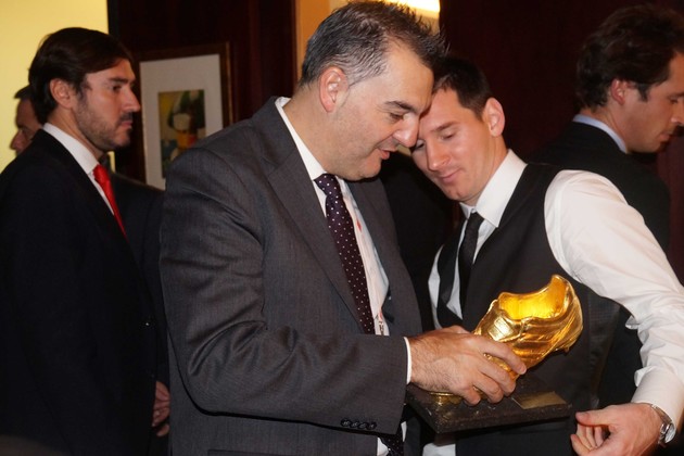 “Lio, ¿pesa mucho?”. Fue la pregunta del enviado especial de El Litoral (único medio de la Argentina) a Messi en la premiación en Barcelona. Y el crack rosarino se lo prestó un ratito al botín dorado para lo pueda disfrutar. Foto: El Litoral