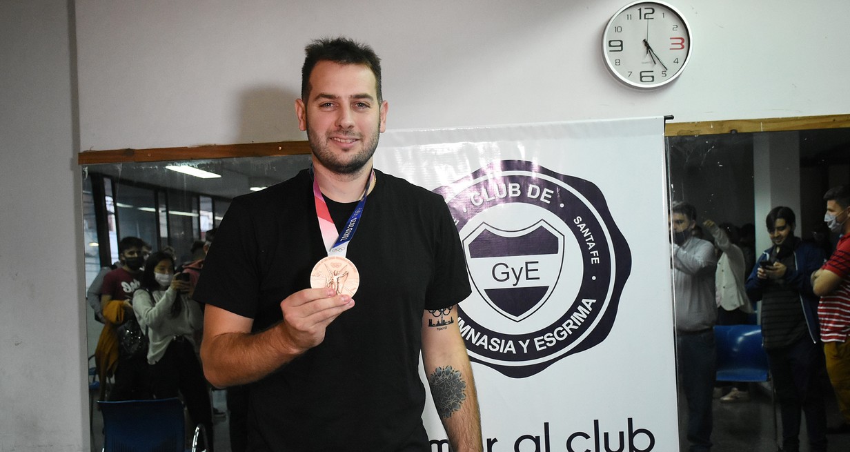 De Cecco posando en su casa deportiva junto a la medalla de bronce obtenida en Tokio 2020. Crédito: Pablo Aguirre