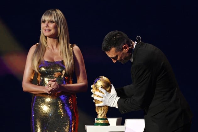 La escena marcó la continuidad de una tradición simbólica impulsada por la FIFA, que honra al último campeón con un rol destacado en la gala de presentación del torneo siguiente. Esta vez, el escenario fue compartido con la conductora Heidi Klum, quien ofició de presentadora principal del evento.
