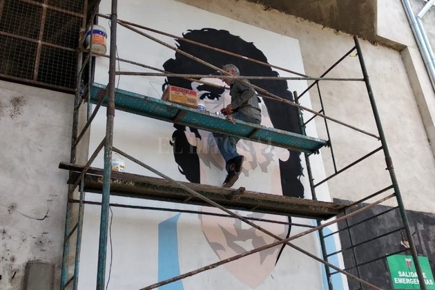 Con un consumo de varios litros de pintura, con medidas de 5 metros por 3.5 metros, el mural del tributo a Diego Armando Maradona ya está "casi listo", sobre calle Rodríguez Peña, en uno de los accesos de la hoy cerrada Platea Este por las cuestiones de la pandemia.