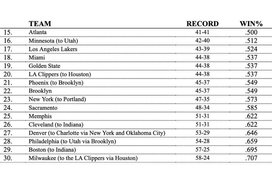 Cuanto peor clasificado, más opciones de conseguir elegir primero. Mediante este mecanismo, las 30 franquicias seleccionan un total de 60 jugadores que proceden de equipos de las universidades estadounidenses o de ligas del resto del mundo.