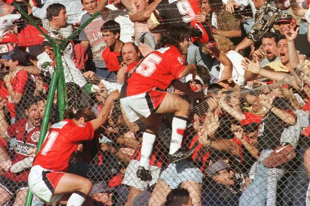 Archivo El festejo enloquecido de Nelson Agoglia y el Tuca Risso trepándose al alambrado de la tribuna este. Nadie se olvida de ese gol.