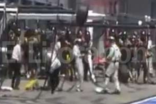 Un cámara británico que se encontraba en la zona de boxes de espaldas recibió el impacto del neumático en la cabeza y cayó al suelo aparatosamente.