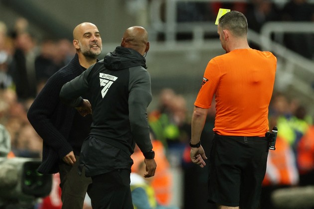Pep Guardiola discutiendo con la terna arbitral.