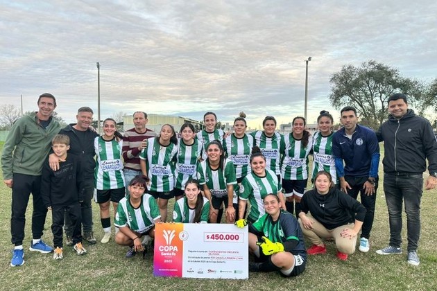 El festejo de las firmatenses con el cheque por el pase de ronda. Foto: Sur24.