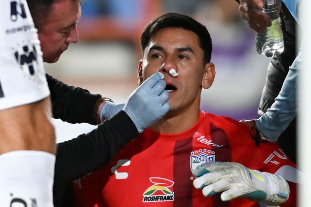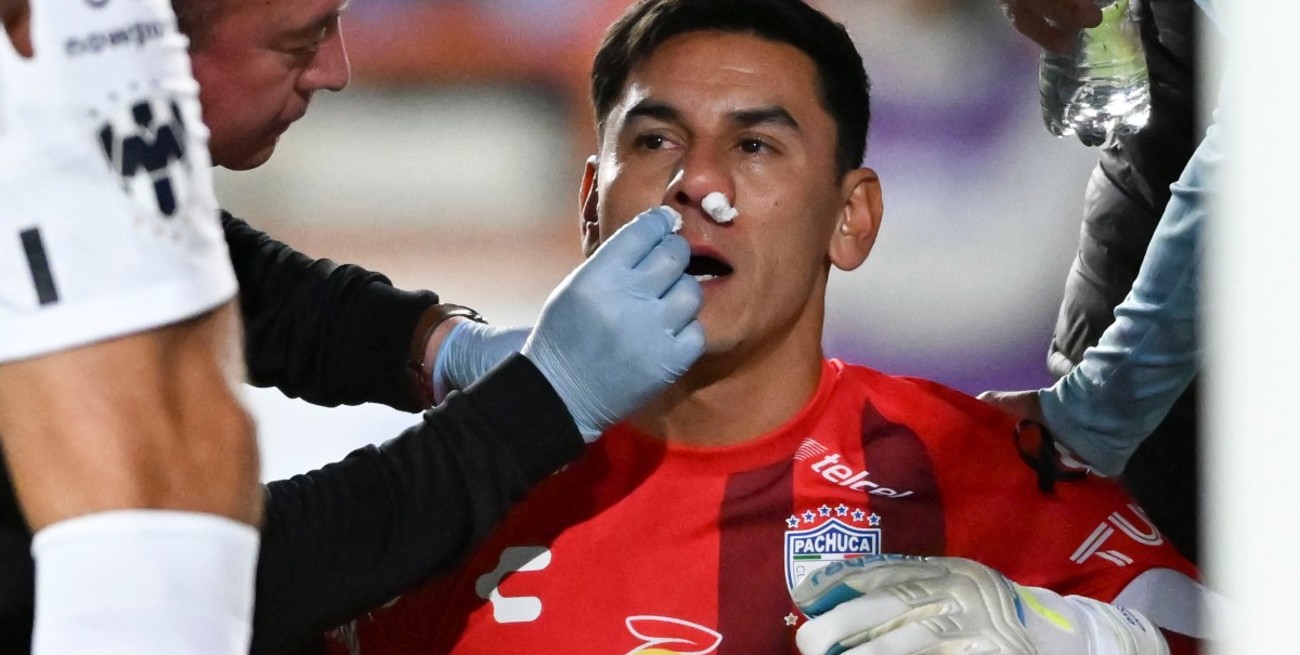 En la jugada, el arquero recibió un golpe en la nariz que le provocó un sangrado y los médicos de Pachuca le pusieron un par de tapones para poder continuar en el partido.