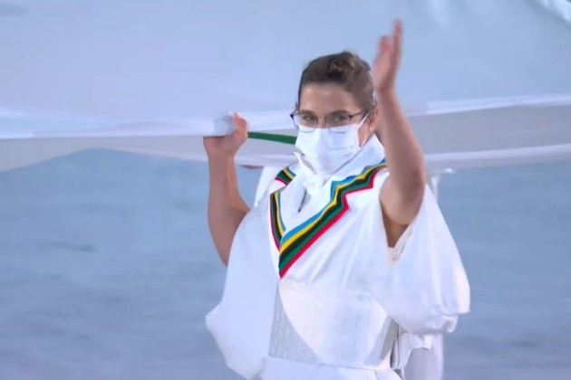 Pareto, de 35 años y médica traumatóloga, ingresó al recinto con la bandera blanca que tiene estampados los cinco anillos olímpicos. Fue acompañada por cinco atletas con historia en la competencia, con quienes entregó en el centro del escenario la enseña a un grupo de seis trabajadores de la salud.