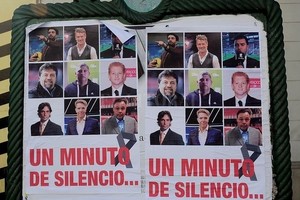 Los carteles piden "un minuto de silencio". Tienen un crespón negro y las fotos de algunos periodistas deportivos. La mayoría está realizando la cobertura del Mundial en Rusia para TyC Sports como Diego Díaz, Marcelo Palacios, Leonardo Farinella (además es director del diario Olé), Flavio Azzaro y Hugo Balassone.