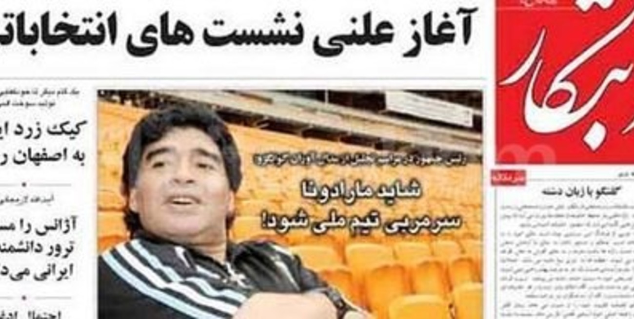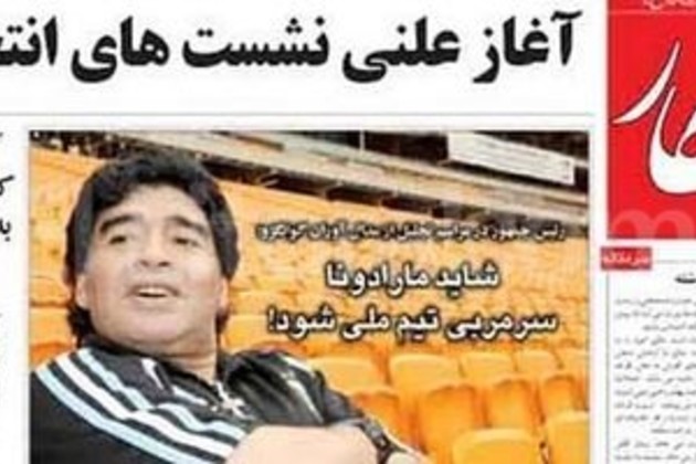 El rotativo abre su edición de este lunes con una gran foto a dos columnas del astro sudamericano y el significativo título “ Presidente Ahmadineyad: Maradona debería ser el primer entrenador de nuestro equipo nacional”. En el cuerpo de la noticia señala que el mandatario asintió con la cabeza cuando un grupo de periodistas locales le preguntaron sobre los insistentes rumores de que el futbolista argentino visitará en breve Irán y se hará cargo de la selección.