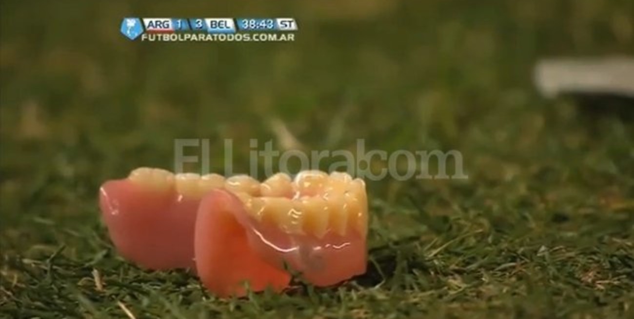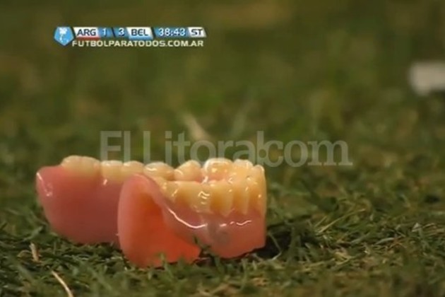 Cuando la derrota por 3 a 1 ante Belgrano estaba casi consumada, aterrizó sobre el césped una dentadura postiza muy cerca del banco de suplentes del "Bicho". El hincha deberá afrontar, además de la angustiante realidad de su equipo, un gastó grande en el odontólogo.
